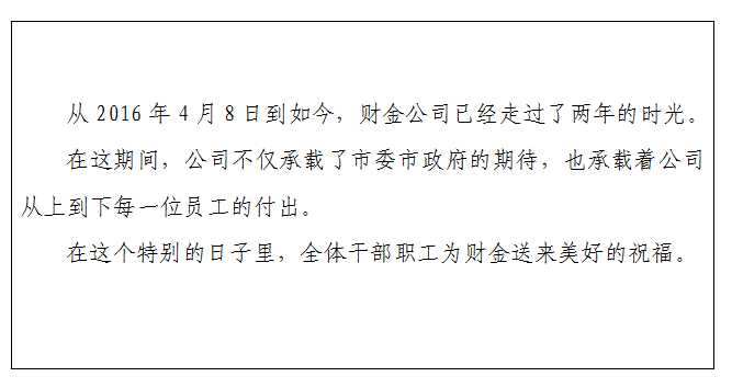 回首過(guò)去,我們倍感自豪,展望未來(lái),我們信心滿(mǎn)滿(mǎn)。值此公司成立兩周年之際,衷心希望和祝愿公司的明天更加美好,讓我們繼續保持和發(fā)揚,迎難而上、勇于擔當的財金精神,積極進(jìn)取,奮力拼搏,再寫(xiě)新篇章,再創(chuàng )新輝煌。