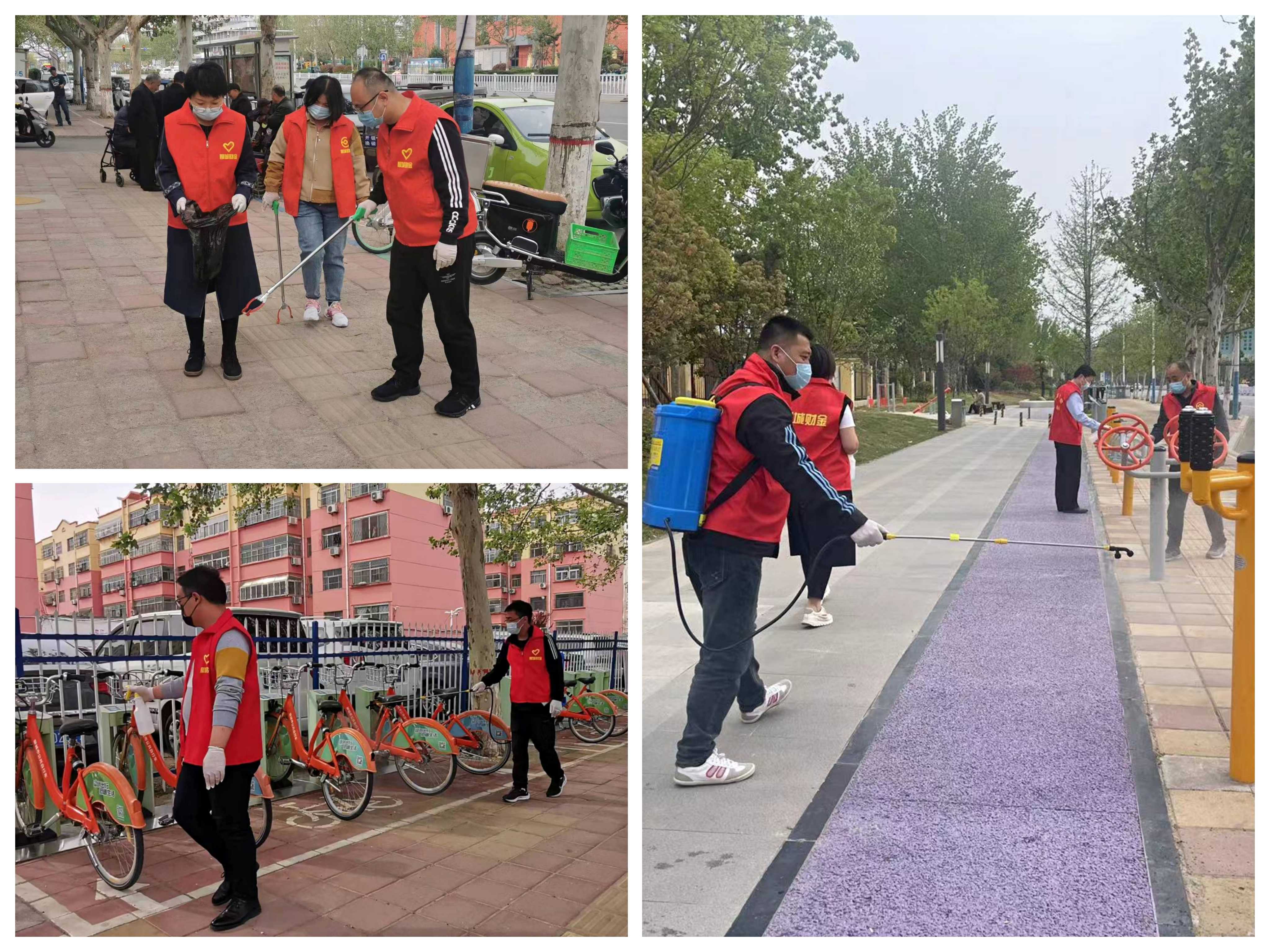 活動(dòng)開(kāi)展過(guò)程中,志愿者們嚴格按照防疫規定佩戴口罩、手套,做好自身防護,同時(shí)對過(guò)往群眾宣講疫情防控規定,提醒佩戴口罩和遵守防疫距離,勸阻扎堆聚集行為。有的同志手持酒精噴壺對路旁健身器材、坐椅、公共自行車(chē)等公共設施進(jìn)行消毒,有的同志身背消毒水噴霧器進(jìn)行大面積路面消殺,有的同志使用工具對地面和綠化帶中垃圾進(jìn)行清理。